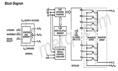 از قابلیت های پتانسیومتر دیجیتال X9C104S می توانیم به این مورد اشاره کنیم که درجه پتانسیومتر را برای ما تا 100 سال حفظ می کند و در ساختار خودش از یک EEPROM بهره برده ، یعنی اگر منبع تغزیه قطع شود درست از جای قبلی کارها شروع می شود و این بسیار عالی است.